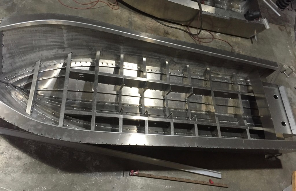 Interlocking sub frames, girders and hull stringers make for a strong open hull design that is economical to build.